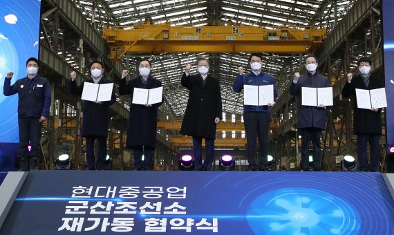 산업통상자원부와 고용노동부는 24일 현대중공업 군산조선소에서 현대중공업, 전라북도, 군산시와 함께 '군산조선소 재가동을 위한 협력협약'을 체결했다고 밝혔다.