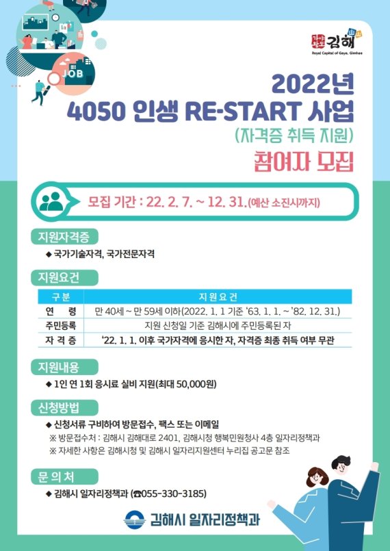 4050 인생 RE-START사업은 만 40세부터 만 59세 이하의 김해시민 400명을 대상으로 하며 국가기술자격증 또는 국가전문자격증 응시 시 연 1회 최대 5만원까지 응시료를 지원한다.