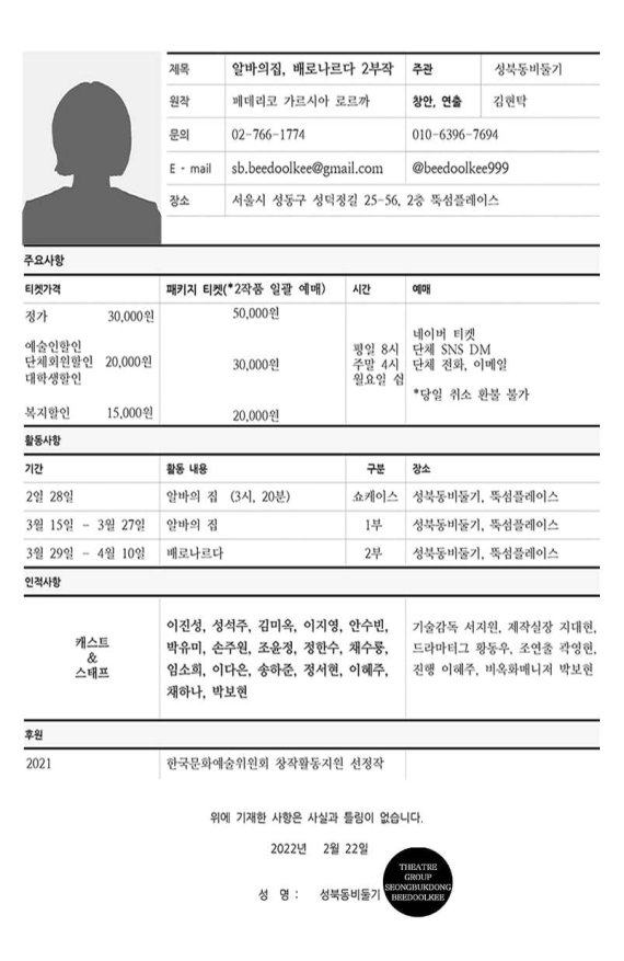 ◇ 연극 알바의집, 배로나르다/ 극단 성북동비둘기/ 2월28일, 3월15~27일, 3월29일~4월10일/ 서울 뚝섬플레이스
