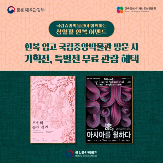 삼일절에 한복을 입고 국립중앙박물관에 방문하면 현재 전시하는 기획전 '조선의 승려 장인'과 특별전 '칠(漆), 아시아를 칠하다'를 무료로 관람할 수 있다.