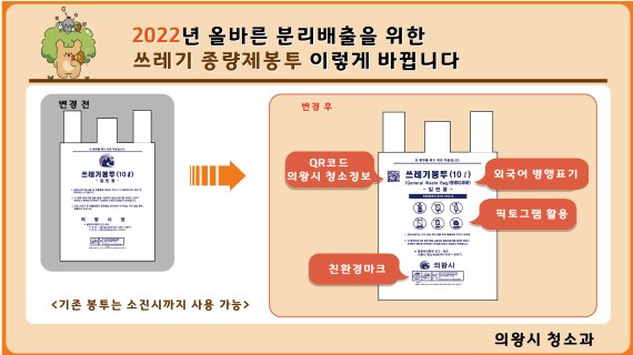 [의왕=뉴시스]박석희 기자 = 경기 의왕시는 올바른 쓰레기 배출문화 확산을 위해 종량제봉투 겉면에 외국어를 병행 표기 하는 등 디자인을 변경했다고 28일 밝혔다. 이날 시에 따르면 기존 종량제봉투는 사용 방법이 한글로만 표기돼 있다.