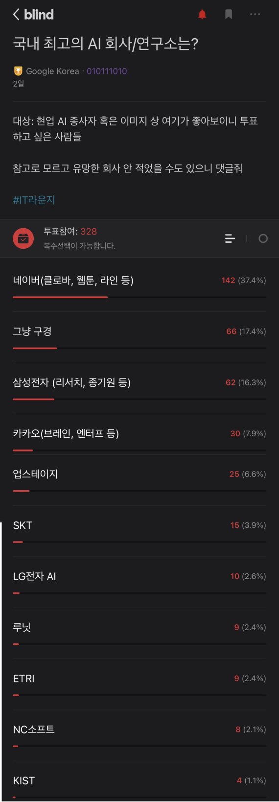 1일 IT 업계에 따르면 직장인 커뮤니티 블라인드의 IT 라운지에는 지난 26일 구글코리아 임직원이라고 밝힌 익명의 글쓴이가 '국내 최고의 AI 회사·연구소'라는 제목으로 국내 손꼽히는 AI 기업(계열사 포함) 및 기관 11곳에 대한 순위 투표를 진행했다.