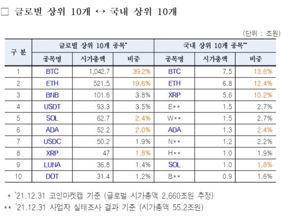 1일 금융위원회 산하 금융정보분석원(FIU)가 시행한 '2021년도 하반기 가상자산사업자 실태조사 결과'에 따르면 금융위원회 정식 신고를 마친 24개 거래소 사업자(원화마켓 4곳·코인마켓 20곳)들의 지난해 연말 기준 비트코인 시가총액 비중은 13.6%로 나타났다.