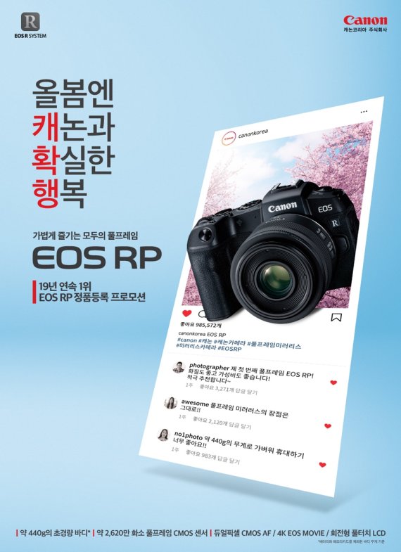 캐논코리아는 이를 기념해 프로모션 이벤트를 기획했다. 프로모션 대상 기종은 풀프레임 미러리스 카메라 1종(EOS RP) 및 풀프레임 DSLR 카메라 2종(EOS 5D Mark IV, EOS 6D Mark II) 등 3종이다.
