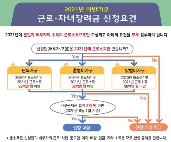 소득 요건은 2020년 총소득과 2021년 근로소득이 기준 금액에 해당해야하며, 올해는 기준 금액이 200만원 상향됐다. 이에 따라 단독가구의 경우 2200만원, 홑벌이 가구는 3200만원, 맞벌이 가구는 3800만원 미만이 기준이다.