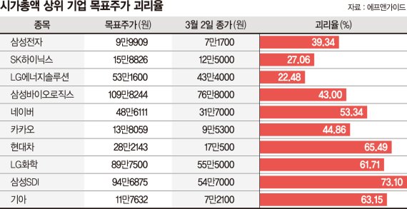2일 금융정보업체 에프앤가이드에 따르면 삼성전자와 LG에너지솔루션, SK하이닉스 등 유가증권시장 시가총액 상위 10개종목의 목표주가 대비 주가 괴리율은 49.35%에 달했다. 시가총액 상위 10개 종목의 주가가 현 주가보다 50% 가까이 상승여력이 있다는 의미다. 목표주가 괴리율이란 증권사 애널리스트가 제시한 목표주가와 현재 주가의 차이를 백분율로 환산한 지표를 말한다.
