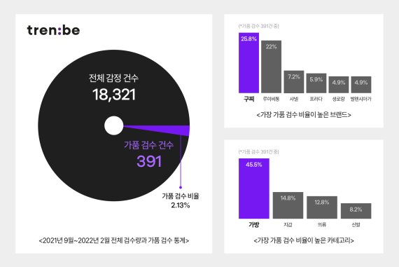 가품으로 가장 많이 검수된 브랜드는 구찌(25.8%)와 루이비통(22%)이었다. 다음으로 샤넬(7.2%), 프라다(5.9%), 생로랑(4.9%), 발렌시아가(4.9%) 등 순이었다.
