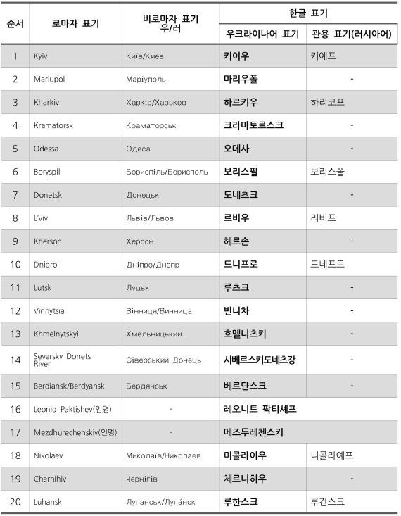 다만 '마리우풀' '크라마토르스크' '오데사' '루츠크' 등은 우크라이나어와 러시아어 발음이 동일하기 때문에 현재 표기하는 대로 쓴다.