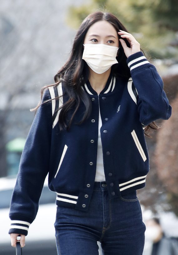 이날 방송국에 들어서는 정수정의 모습이 눈길을 끌었다. 정수정은 흰 티셔츠에 청바지를 입고 나타났다.
