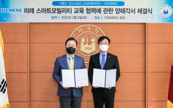 [인천=뉴시스] 김동영 기자 = 인하대학교는 8일 ‘지멘스 디지털 인더스트리 소프트웨어’와 미래 스마트 모빌리티 분야의 고급 R&D 인력 양성과 융합공학 능력을 갖춘 인재양성 지원을 내용으로 하는 상호 산학협력협약(MOU)을 체결했다.