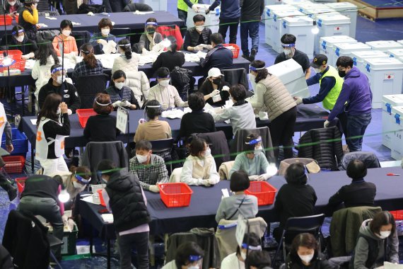중앙선거관리위원회에 따르면 이날 오후 8시11분쯤 경북을 시작으로 현재 전국에서 개표가 진행 중이다.