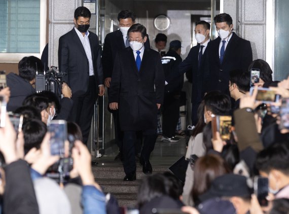 (서울=뉴스1) 한재준 기자,이준성 기자 = 9일 치러진 제20대 대통령 선거에서 윤석열 국민의힘 후보의 당선이 유력한 가운데 이재명 더불어민주당 후보가 개표율이 90%를 넘어선 10일 오전 침묵을 유지한 채 취재진에 모습을 드러냈다.