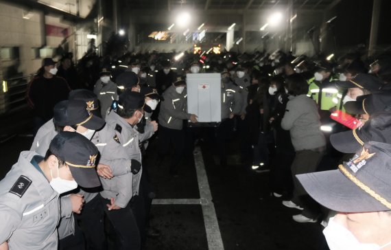 [인천=뉴시스] 김동영 기자 = 제20대 대통령 선거 투표가 종료된 10일 새벽 인천 부평구 삼산월드체육관 주차장에서 경찰이 유튜브 채널 '가로세로연구소(가세연)'측 및 일부 인천시민들과 투표함 이송을 두고 대치하던 중 강제로 투표함을 빼앗아 개표소로 가지고 가고있다. 2022.03.10. dy1021@newsis.com [인천=뉴시스] 이루비 기자 = 10일 오전 4시30분께 인천 부평구 삼산체육관에서 '부정선거 논란'이 불거진 '산곡2동 제4투표소 투표함'이 개표소 안으로 이송됐다.