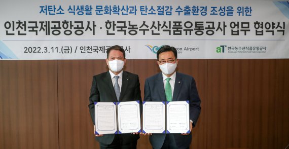 (인천공항=뉴스1) 정진욱 기자 = 인천국제공항공사(사장 김경욱)는 11일 공사 회의실에서 한국농수산식품유통공사(사장 김춘진)와 'ESG 실천과 저탄소 식생활 문화 확산을 위한 업무 협약식'을 했다고 밝혔다.