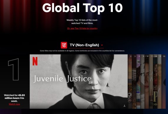 전 세계 넷플릭스 이용자들이 3월 첫째 주(2월 28일~3월 6일까지) '소년 심판'을 시청한 시간은 총 4593만 시간. 비영어권 드라마 부문에서 2위를 기록하고 있는 콜롬비아 드라마 '카페 콘 아로마 드 무헤르' 시청시간인 2754만 시간 보다 압도적으로 높다.