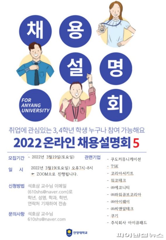 【파이낸셜뉴스 안양=강근주 기자】 안양대학교 아리교양대학 석호삼 교수가 진행하는 ‘2022 안양대 온라인 채용설명회’가 오는 19일 ZOOM을 통해 진행된다.