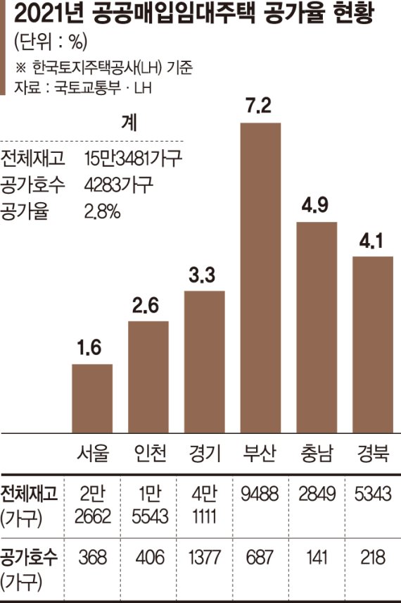 13일 국토부에 따르면 지난해 전국의 한국토지주택공사(LH) 매입임대주택 총 15만3481가구 중 공가는 4283가구로 공가율은 2.8%다. 서울 매입임대주택 총 2만2662가구 중 공가는 368가구(1.6%)로 수도권에서 가장 적었다.
