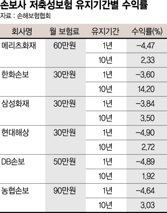 15일 손해보험협회에 따르면 손보사들의 저축성보험은 납입기간인 10년을 채워야 2~3% 수익이 나는 것으로 조사됐다.