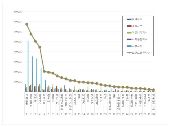 게임 상장기업의 브랜드 평판 지수는 Δ참여지수 Δ소통지수 Δ커뮤니티지수 Δ사회공헌지수 Δ시장지수를 통해 도출된다. 정성적인 분석 강화를 위해 ESG 관련 지표와 오너리스크 데이터도 분석에 포함됐다.
