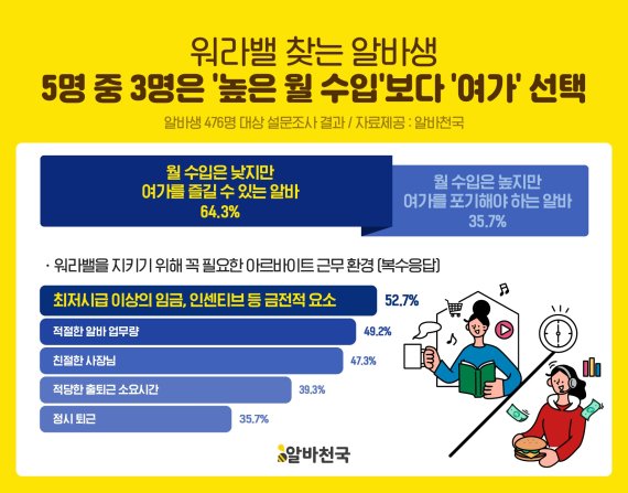 17일 구인구직 아르바이트 전문 포털 '알바천국'이 알바생 476명에게 '월 수입'과 '여가' 중 양자택일하게 하자 64.3%가 상대적으로 근무시간, 시급이 적어 월 수입은 낮지만 여가를 즐길 수 있는 아르바이트를 선택했다.