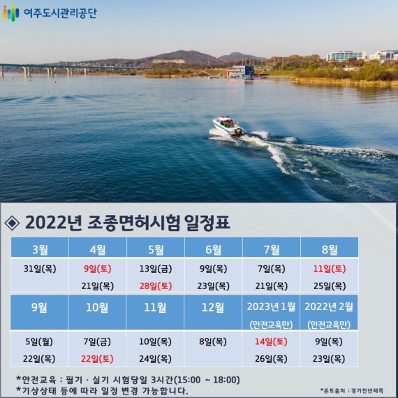 조종면허시험 정보는 수상레저종합정보시스템 홈페이지 (https://boat.kcg.go.kr)를 통해 확인할 수 있으며 여주시수상센터(031-880-4084)로 문의하면 된다.