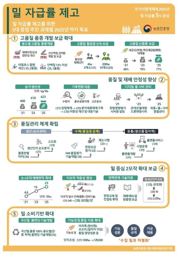 농림축산식품부는 밀산업 육성기본계획에 따라 2025년까지 전체 재배면적인 3만㏊의 절반을 고품질 밀 전문단지로 조성할 계획이다. 올해 1월 기준 51개 생산단지 7663㏊를 전문단지로 선정했다.