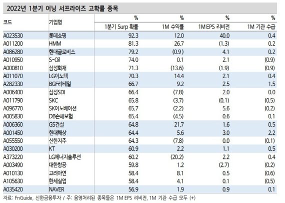 그러면서 "2022년 1분기 서프라이즈가 예상되고, 기관수급 유입과 애널리스트 주당순이익(EPS) 상향 종목들을 눈여겨봐야 한다"면서 "해당 종목은 롯데쇼핑, 현대글로비스, LG이노텍, BGF리테일, GS건설, 현대해상, KT, NAVER"라고 판단했다.
