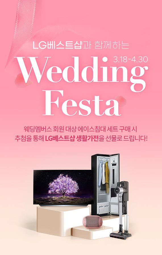 ▲에이스침대는 18일부터 4월30일까지 예비부부를 위한 멤버십 서비스인 '에이스 웨딩멤버스'에 가입한 고객을 대상으로 추첨을 통해 LG가전을 증정하는 '웨딩페스타' 프로모션을 진행한다. 이번 웨딩페스타 프로모션을 통해 300만원 이상 제품을 구매한 웨딩멤버스 회원에게 추첨을 통해 신혼살림 장만에 도움이 되는 LG베스트샵 인기 생활가전을 경품으로 증정한다.