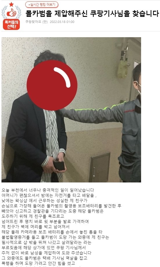 B씨의 친구는 인터넷 커뮤니티에 "쿠팡 기사님이 몰카범을 제압하고 경찰이 올 때까지 자리를 지켜주셨다"면서 "연락처를 물어봤지만, 당연히 도와줄 일을 했다고 하시며 가버리셨는데 꼭 감사의 인사를 드리고 싶다"는 글을 게재했다.
