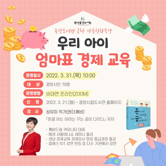 김미라 도서관운영과장은 "가정생활에 도움이 되는 실용적인 강연을 통해 경제교육의 중요성을 배우고, 부모와 자녀가 함께 성장하는 의미 있는 시간이 될 것"이라고 전했다.