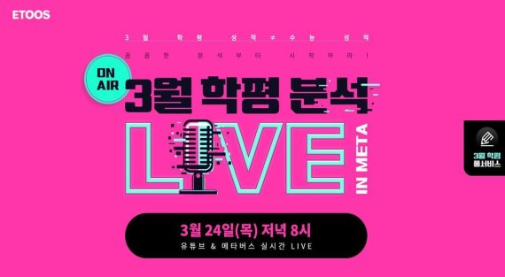 아울러 학평 당일 저녁 8시부터 김병진 이투스 교육평가연구소장이 '3월 학평 분석 및 2023 대입 성공 전략'을 주제로 한 온라인 라이브 설명회를 통해 Δ3월 학평 체크 포인트 Δ모의고사, 학습도구 활용법 Δ2023 입시 쟁점과 대응전략 등을 짚어준다.