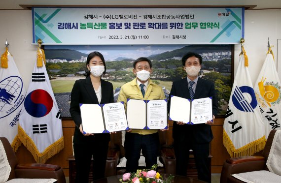[김해=뉴시스] 김상우 기자 = 경남 김해시는 지역 농특산물 홍보와 판로 확대를 위해 ㈜LG헬로비전 경남가야방송, 김해시조합공동사업법인과 업무협약(MOU)을 체결했다고 21일 밝혔다.