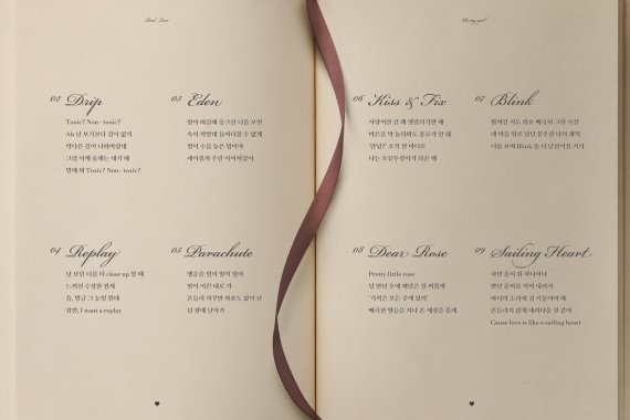 공개된 이미지는 '드립'(Drip), '에덴'(Eden), '리플레이'(Replay), '패러슈트'(Parachute), '키스 앤드 픽스'(Kiss & Fix), '블링크'(Blink), '디어 로즈'(Dear Rose), '세일링 하트'(Sailing Heart/항해) 등 타이틀곡 '리얼 러브'와 함께 수록된 8개 트랙의 가사가 담겨 있다. 특히 책의 페이지를 가득 채운 수록곡의 가사가 여러 편의 사랑 시를 연상케 해 로맨틱한 무드를 더욱 끌어올리고 있다.
