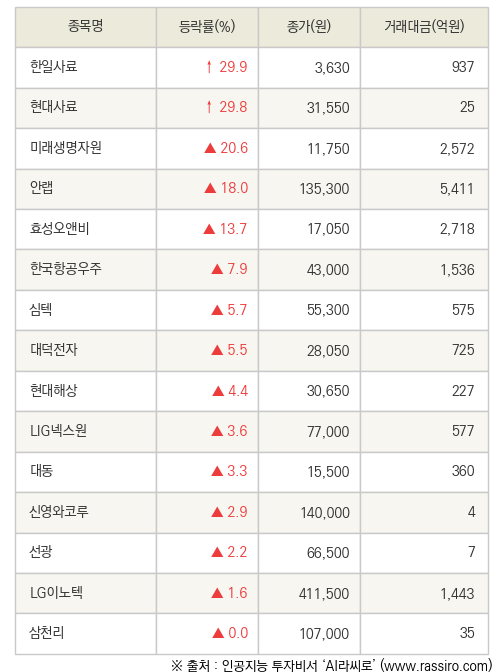 [fnRASSI]한일사료, 현대사료 등 15종목 52주 신고가 경신