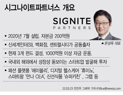 시그나이트는 작년 10월 기준 펀드 운용 규모를 1000억원 넘게 늘리며 벤처투자업계에서 빠르게 영향력을 확대해가고 있다. 출범 첫 해 '스마트신세계시그나이트투자조합'(500억원 규모)을 결성한 후 지난해 '스마트신세계포커스투자조합'(300억원 규모)과 '신세계웰니스투자조합'(182억원 규모)을 연이어 조성했다.