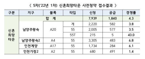 5차 공공 사전청약 신혼희망타운 경쟁률 4.3대 1