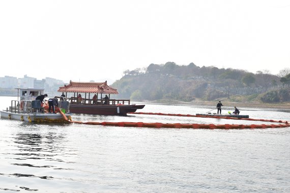 [진주=뉴시스] 정경규 기자 = 경남 진주시는 24일 남강 유람선 ‘김시민호’운영과 관련해 오는 4월 정상 운항을 앞두고 유람선 진수 등 마무리 사업이 진행됨에 따라 기름 유출 상황을 가정한 비상사태 모의훈련을 실시했다.