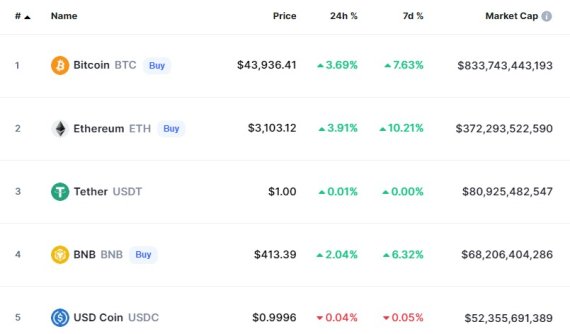 비트코인은 25일 오전 6시40분 현재 글로벌 코인시황 중계사이트인 코인마켓캡에서 24시간 전보다 3.69% 상승한 4만3936달러를 기록하고 있다. 약 한 시간 전 비트코인은 4만4131달러까지 치솟았다.