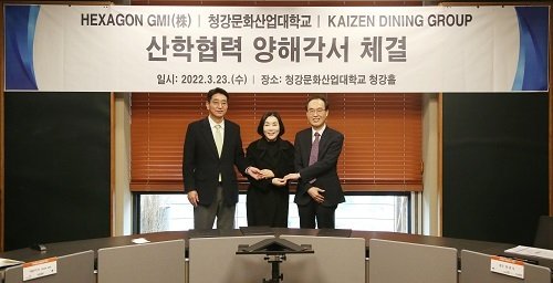 (서울=뉴스1) 황덕현 기자 = 청강문화산업대가 이달 23일 카이젠다이닝그룹, 헥사곤GMI와 상호 간의 유기적 협력 체계를 구축하기 위한 산학협력 업무협약을 맺었다고 25일 밝혔다.