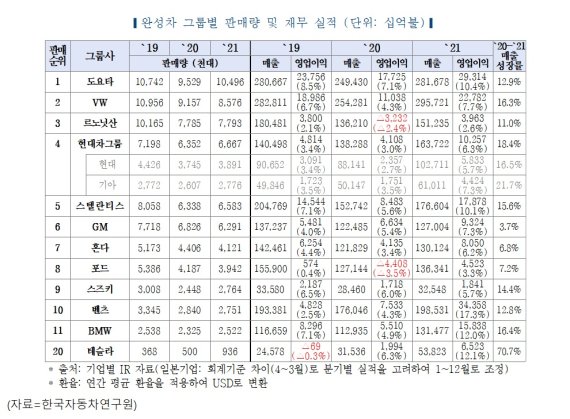 28일 한국자동차연구원이 발간한 '산업동향' 보고서에 따르면 세계 1~11위 완성차업체와 테슬라(20위)의 지난해 매출이 모두 전년 대비 성장했으며, 영업이익 역시 높은 증가세를 보였다.