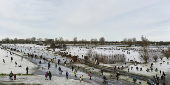 사진 속은 뒤셀도르프 근처의 라인강변 목초지에서 얼음 위를 걷고 있는 사람들이다.