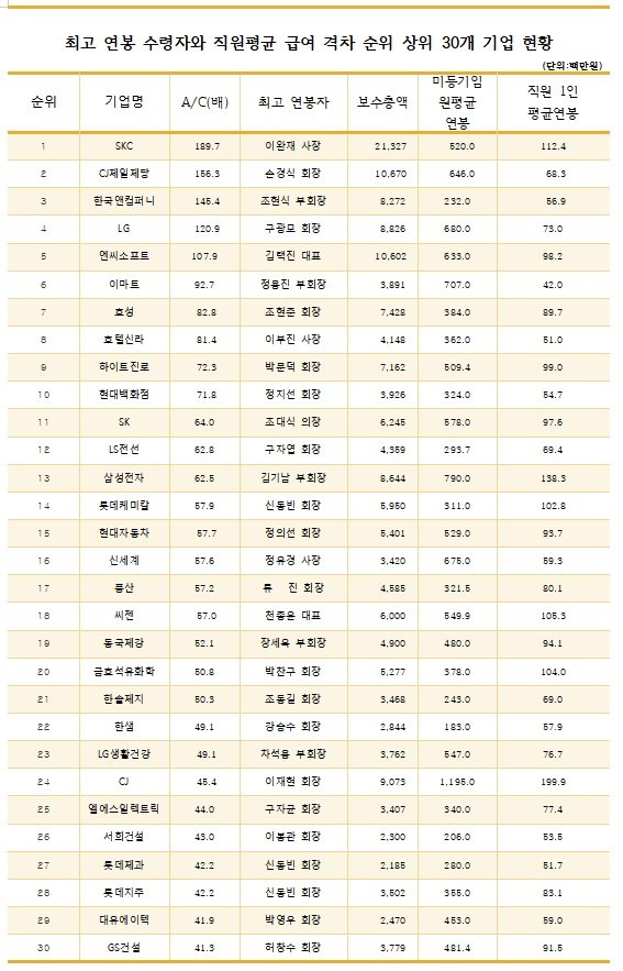 기업별로 최고 연봉자와 일반 직원간 급여 격차가 가장 큰 곳은 SKC로 189.7배 차이다.