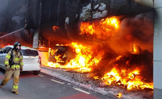마감재를 뚫고 나온 불길은 검은 연기와 함께 천장 전체로 확산했다. 천장에서 떨어진 불덩이는 주차장에 세워져 있던 차량을 덮치기도 했다.