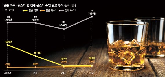 30일 관세청에 따르면 2018년 105만4000달러 수준이던 일본 위스키 수입액은 지난해 315만7000달러로 늘었다. 반대로 2018년 7830만달러를 기록했던 일본맥주 수입은 일본상품 불매운동이 시작된 2019년 4000만달러 이하로 떨어지더니 지난해 687만5000달러에 그쳤다. 일본맥주 수입액이 91% 감소하는 동안 일본 위스키 수입액은 299%나 증가했다.