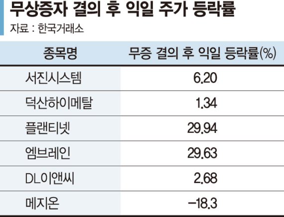 상한가를 기록한 기업도 있다. 지난 17일 플랜티넷은 전 거래일 대비 2000원(29.94%) 오른 8680원로 거래를 마쳤다. 지난 10일 엠브레인도 무상증자 결정에 전거래일 대비 2640원(29.63%) 오른 1만1550원에 거래됐다.