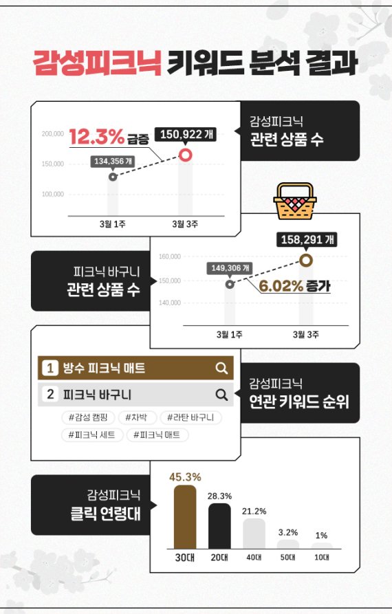 1일 아이템스카우트에 따르면 감성 피크닉 키워드를 활용한 상품수는 3월 1주 13만4356개에서 3월 3주 15만922개로 12.33% 증가했다. 대표 피크닉 용품으로 꼽히는 '피크닉 바구니'로 등록된 상품수 역시 같은 기간 14만9306개에서 15만8291개로 6.02% 늘었다.