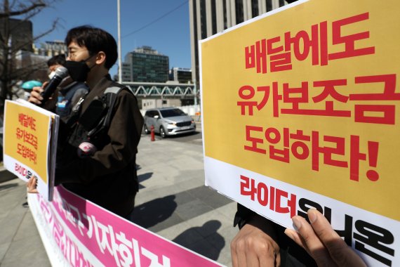 [서울=뉴시스]정유선 기자 = 배달기사들이 기름값 부담을 호소하며 정부에 대책 마련을 촉구했다.