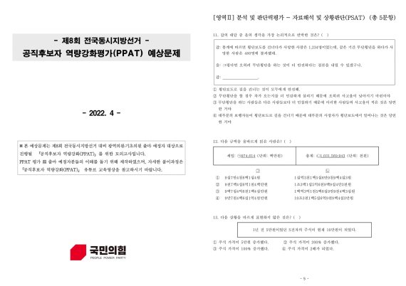 [서울=뉴시스] 양소리 기자 = 국민의힘이 광역·기초의원 후보자를 대상으로 실시하는 '공직 후보자 역량강화평가(PPAT)' 예상문제가 1일 공개됐다.