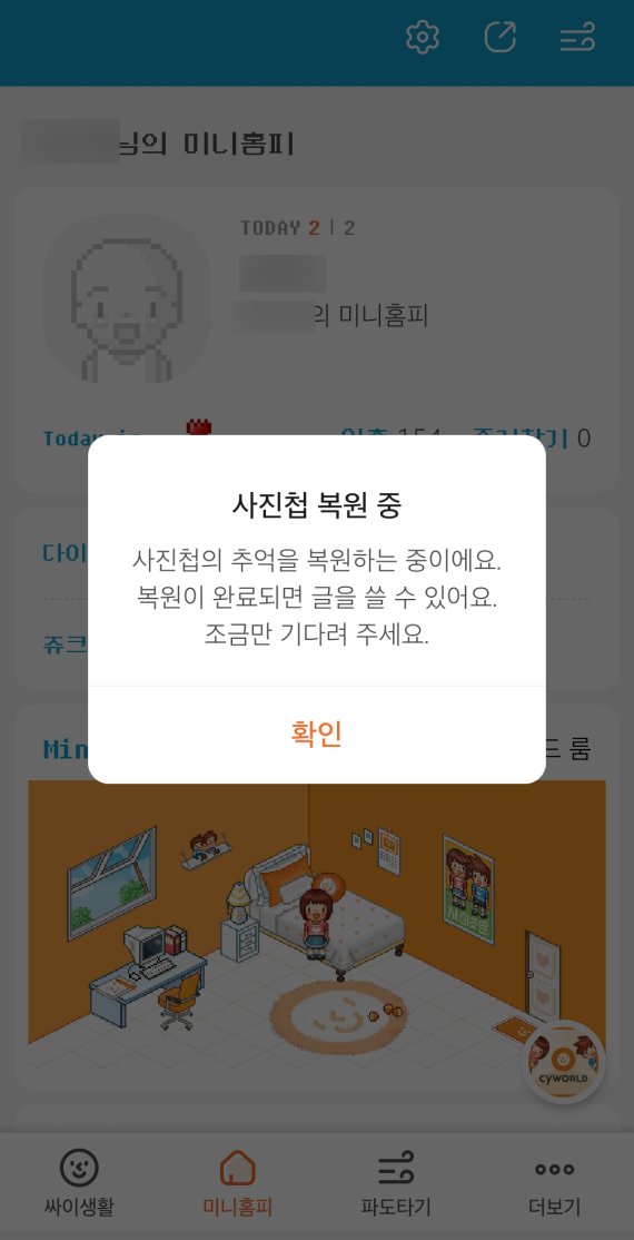 그러나 이날 싸이월드 미니홈피에 접속해 사진첩을 확인한 결과 "사진첩의 추억을 복원하는 중이에요. 복원이 완료되면 글을 쓸 수 있어요. 조금만 기다려 주세요"라는 문구가 나타났다.