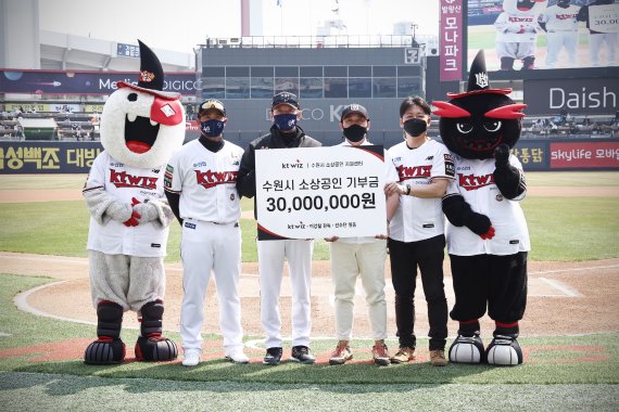 [서울=뉴시스] 문성대 기자 = KT 위즈는 3일 수원 KT위즈파크에서 열린 삼성 라이온즈와의 홈경기에 앞서 이강철 감독, 선수단과 함께 소상공인을 위해 3000만원을 기부했다.